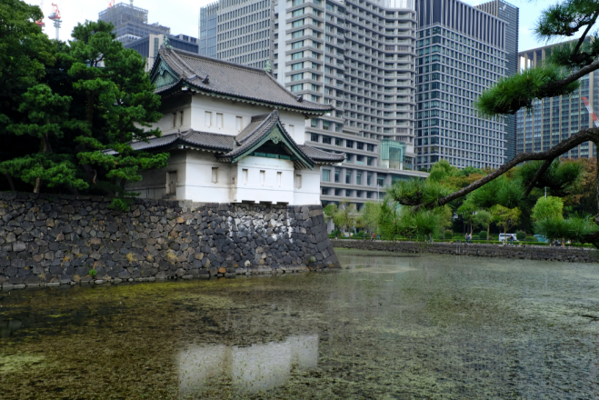Das ist Tokio vom Kaiserpalast aus betrachtet, der leeren, da nicht öffentlich betretbaren, Stadtmitte. Das Foto ist keinesfalls bearbeitet; dass die Bäume anstatt mit Wasser mit grüner Farbflüssigkeit gesprenkelt wurden, halte ich aber für wahrscheinlich. In Tokio liebt man es, wenn das Natürliche so aussieht, als sei es vollkommen künstlich. Ja, das Künstliche besitzt einen sehr hohen Stellenwert und steht keinesfalls – wie bei uns – für das Unechte, Manipulierte, Nichtauthentische etc.